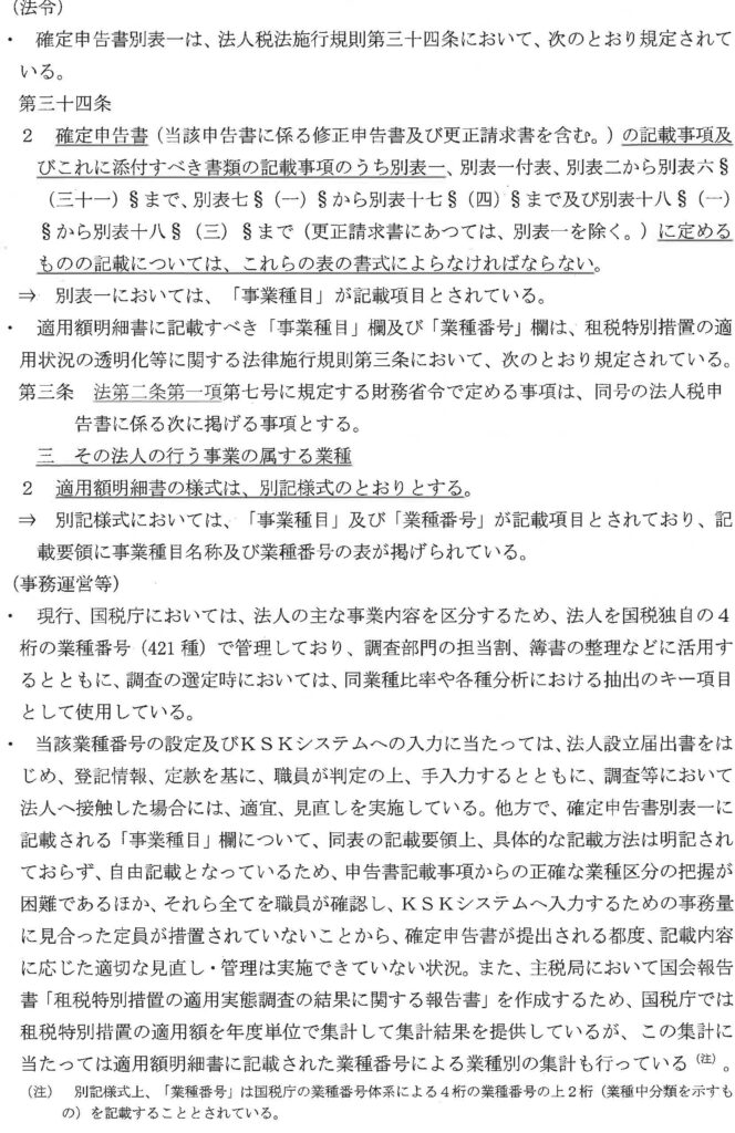 (注) 租税特別措置の適用状況の透明化等に関する法律施行規則で規定する適用額明細書に記載すべき「事業種目」は、平成22年度の租税特別措置の適用状況の透明化等に関する法律制定時において、既に納税者へ開示されていた国税庁の業種番号と異なる事業種目や業種番号を新たに設けることで起こり得る混乱や記載誤りを防ぐため、国税庁の業種番号体系に合わせた規定としている。