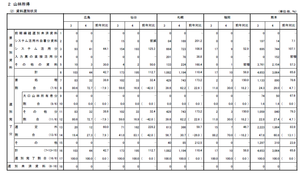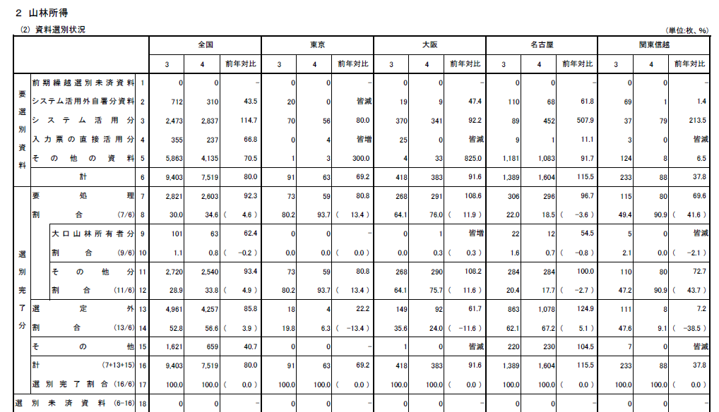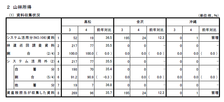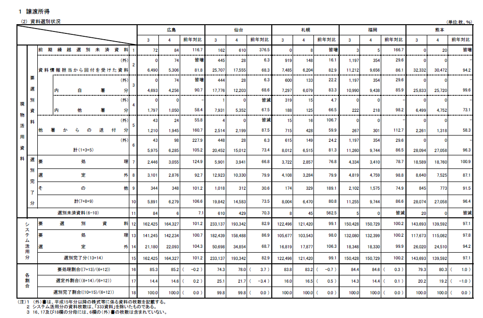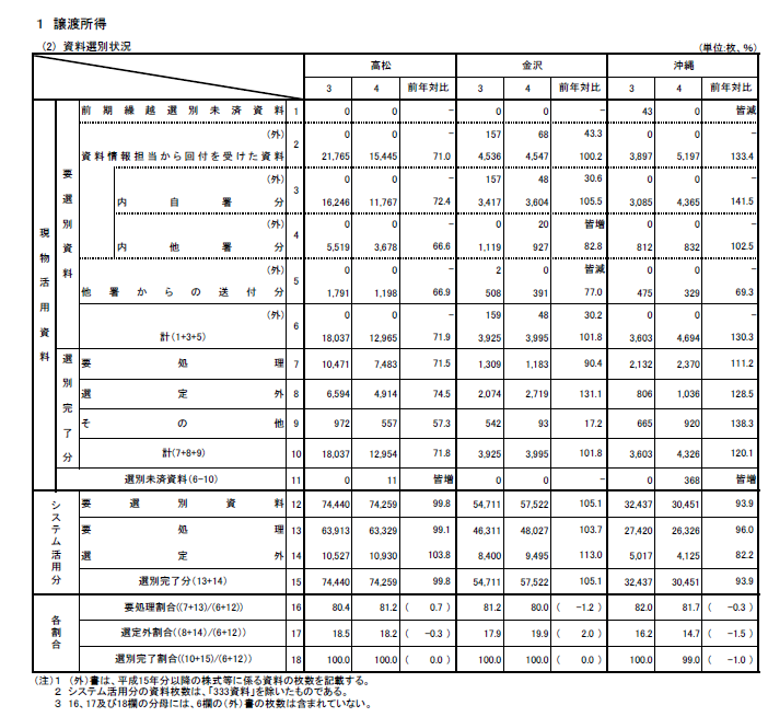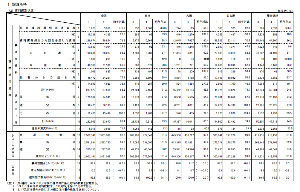 情報公開資料・ダウンロード資料 所得税 税務調査・税務行政 国税庁「譲渡所得・譲渡所得に関する資料の選別等の状況(令和5年4月30日現在)」 令和6年3月29日付の国税庁の資産課税課情報情報第3号「譲渡所得・譲渡所得に関する資料の選別等の状況(令和5年4月30日現在)」の紹介です。 ダウンロード資料: 令和6年3月29日付資産課税課情報第3号「令和4年分 譲渡・山林所得に関する資料の選別等の状況」