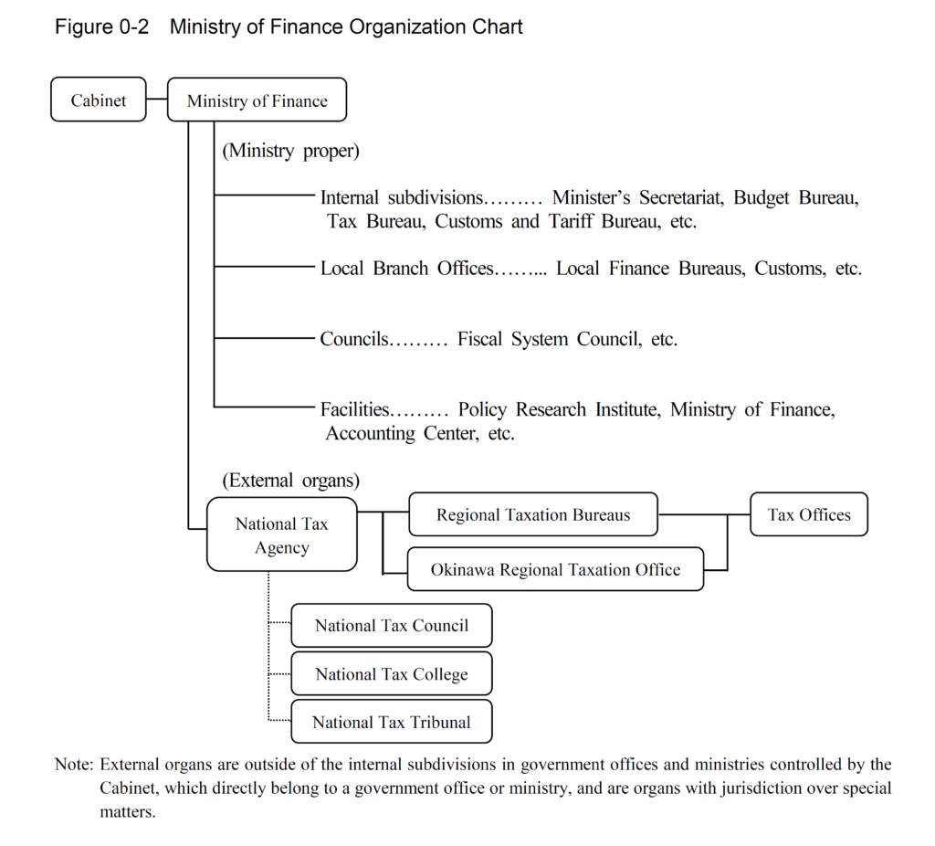 Organs established by legal regulations within the Cabinet (Cabinet Secretariat, etc.), organs placed under the jurisdiction of the Cabinet (National Personnel Authority), those established as the state’s administrative organs (ministries, commissions and agencies), and the Board of Audit.