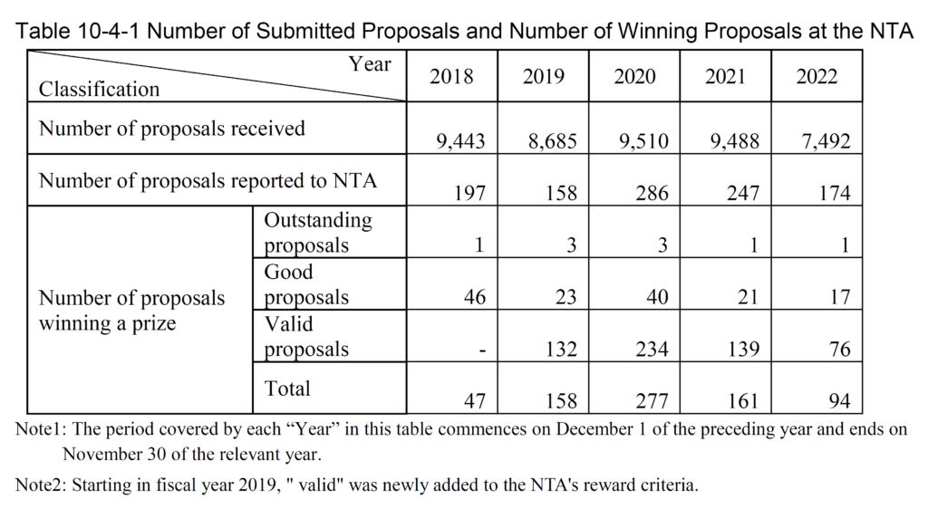 Note: This began as the Suggestion System in 1950 (renamed the “Proposal System” in 1963). After subsequent revisions, this has become well established as an effective measure to improve the efficiency of tax administration.