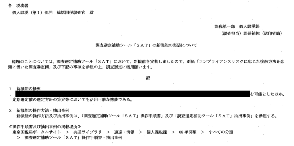 情報公開資料・ダウンロード資料 税務調査・税務行政 東京国税局・人工知能を利用したシステム「調査選定補助ツール「SAT」の新機能の実装」 国税庁が、どの個人に税務調査を行うか=調査選定に利用している人工知能システム「SAT」に新機能が実装されたようです。 東京国税局 人工知能 調査選定補助ツール「SAT」の新機能の実装 ダウンロード 関連記事 東京国税局「令和6事務年度における簡易な接触の実施について(指示)」【人工知能を利用した税務調査選定システム「結」の活用】 国税庁「データ活用推進第三次中期計画について(指示)」(税務調査への人工知能の活用、税務行政のDX) 東京国税局「令和6事務年度 資産税各税の実地調査事務等の実施要領について(指示)」【人工知能知能を利用した相続税選定支援ツールRIN】 令和6年東京国税局「全管特別国税調査官(法人税等・源泉所得税担当)及び法人課税部門統括国税調査官等会議資料」(人工知能の税務調査への活用等)① 令和6年東京国税局「全管特別国税調査官(法人税等・源泉所得税担当)及び法人課税部門統括国税調査官等会議資料」(人工知能の税務調査への活用等)② 国税庁・所得税の税務調査の状況(平成30・令和2~5事務年度):暗号資産の税務調査、インターネット関係の税務調査の傾向【AI(人工知能)の利用増加】