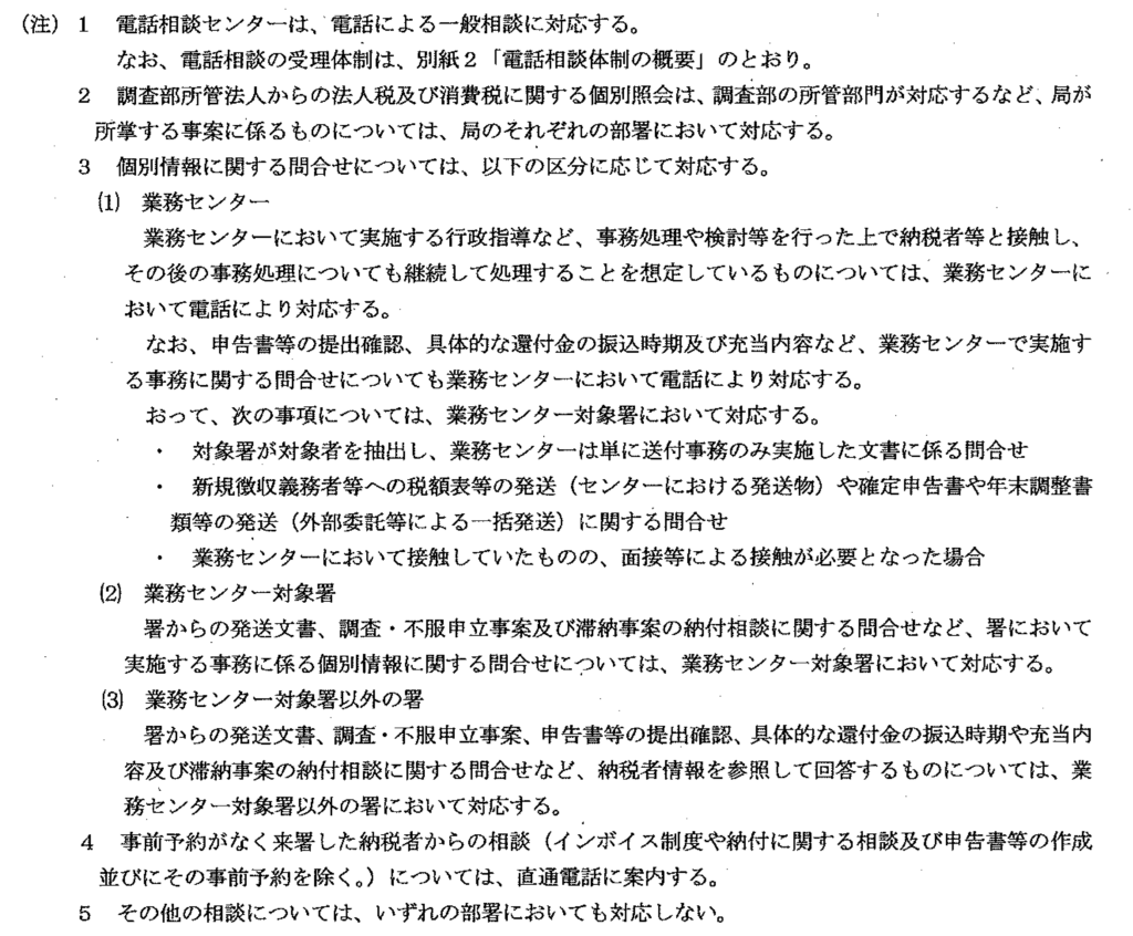 おって、事前予約がない納税者からの相談(インボイス制度や納付に関する相談及び申告書等の作成を除く。)については、相談内容にかかわらず、直通電話へ案内し、電話相談センター職員が、電話相談センターで対応できない相談内容と判断した場合は、改めて署担当者が事前予約等を案内する旨を説明する。