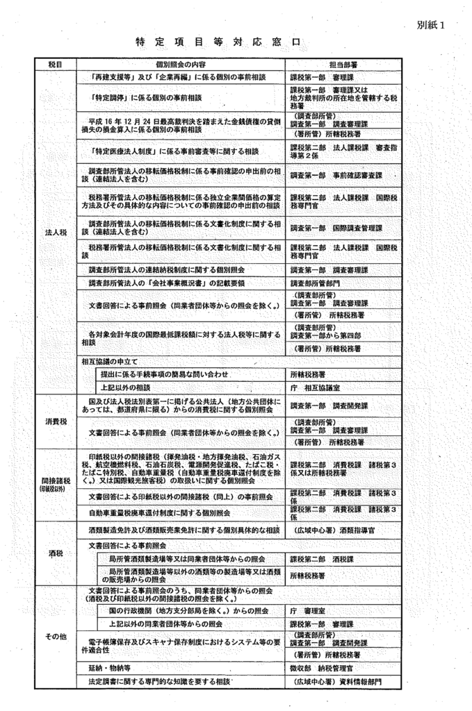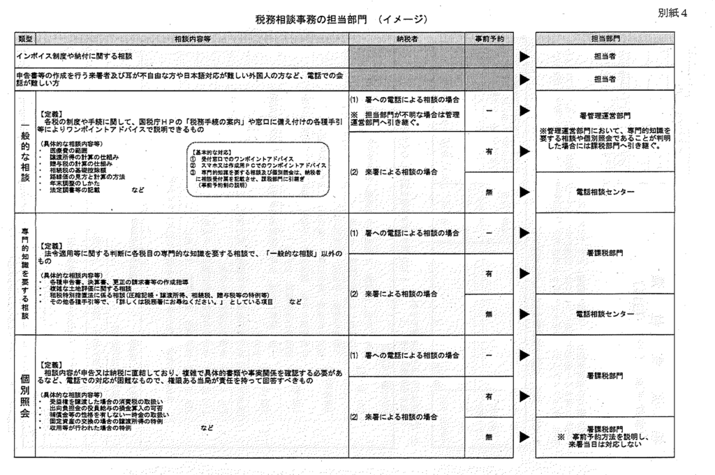 なお、相談内容に応じた対応がより円滑に実施されるよう、税務相談の内容に応じ、各部門が対応すべき範囲について、共通認識を持って適切に対応する(別紙4「税務相談事務の担当部門(イメージ)参照」)。