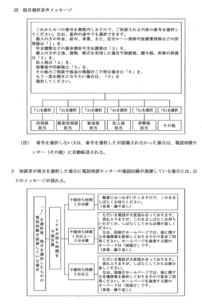 なお、直通電話から受電した電話を、電話相談センター職員が電話相談センターで対応できない相談内容と判断し、所轄署へ電話を転送した際に回線が塞がっている場合には、納税者に対して、「事前予約の上、相談したい」等と署の窓口担当者に申し出るよう説明を行うとともに、個別照会は事前予約が必要なことを説明して切電する。