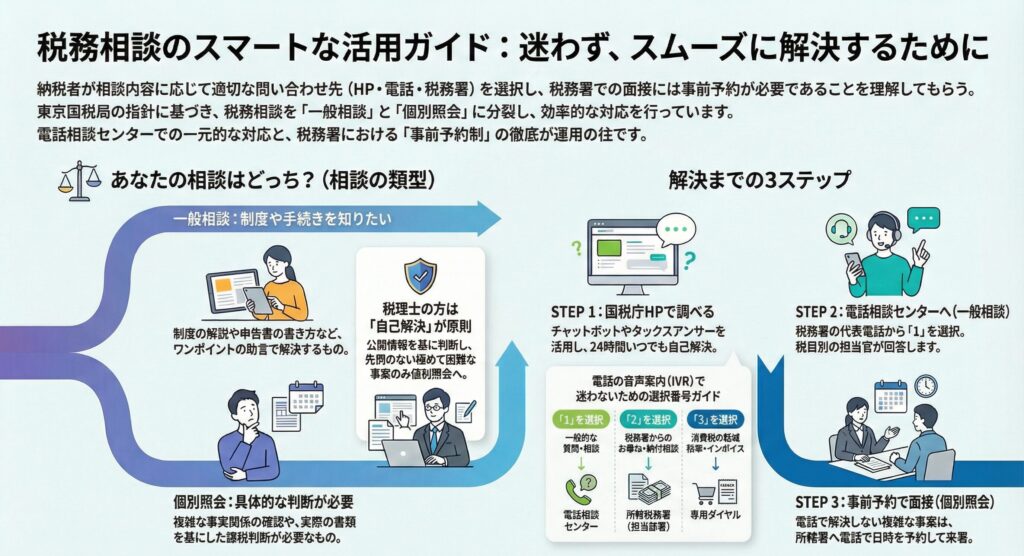 「税金のことで分からないことがあるけれど、いきなり税務署に行っていいの?」「電話だと詳しく教えてもらえないのでは?」と不安に感じていませんか?実は、現在の税務署では効率的で正確な回答を行うために、相談内容によって「電話相談センター」と「税務署での対面相談」の役割を明確に分けています。