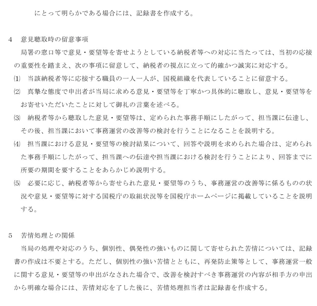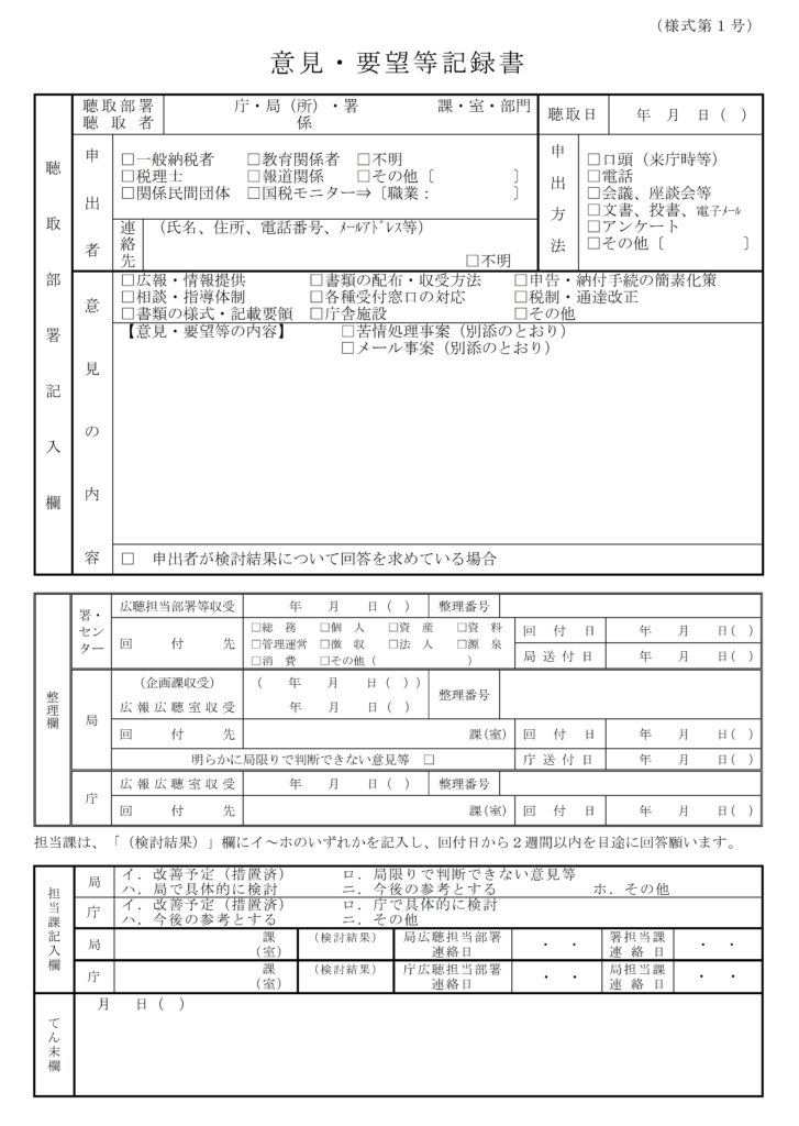 国税庁「『意見・要望等記録書の処理要領』の制定について(事務運営指針)」を取り上げ、