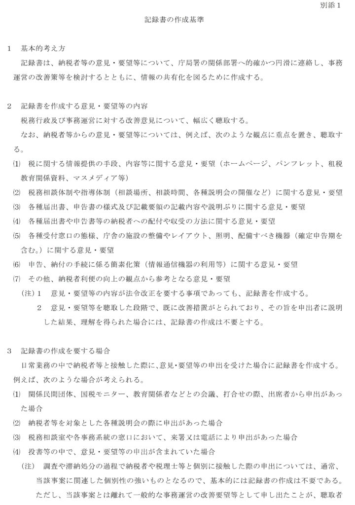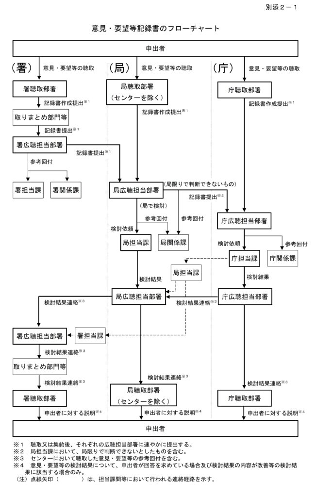 庁、局及び署の職員は、納税者等から税務行政に対する意見・要望等を聴取した場合には、別添1「記録書の作成基準」により、記録書を作成し、庁局署の関係部署へ的確に連絡する(別添2-1「意見・要望等記録書のフローチャート」及び別添2-2「意見・要望等記録書のフローチャート(センター用)」参照)。