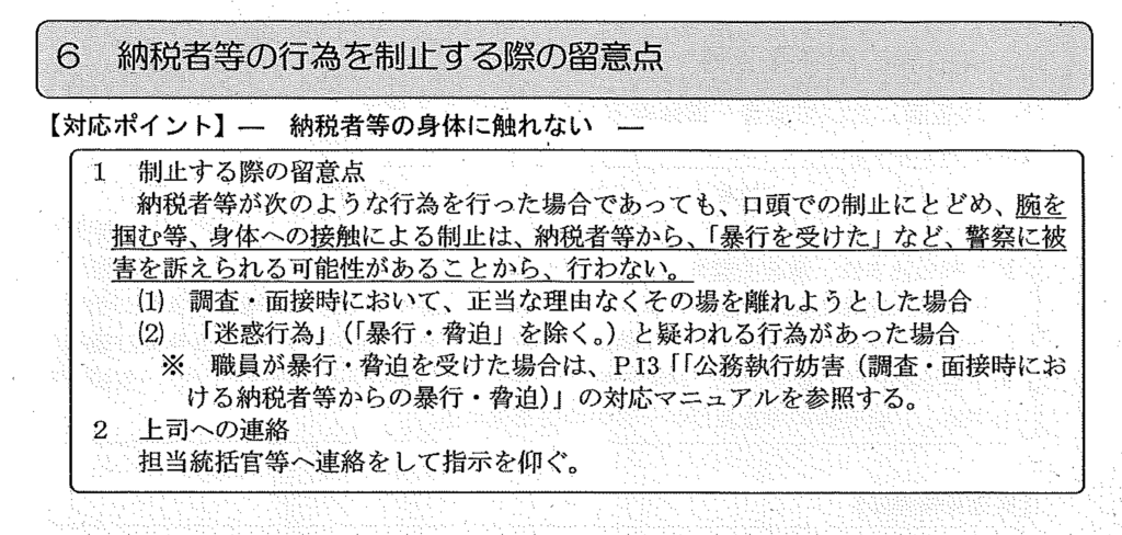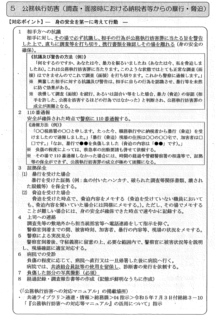 記事の最後に、国税庁「『公務執行妨害への対応等マニュアル』の活用について(指示)」も添付しあります。