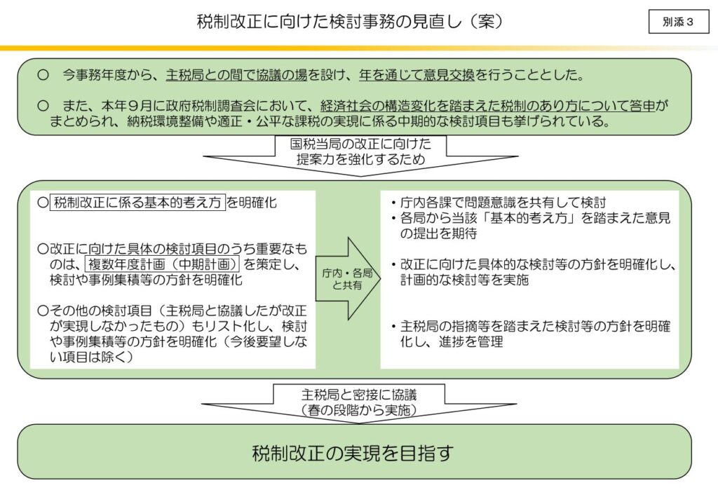 国税庁では、納税者の利便性の向上や適正・公平な課税・徴収を実現する観点から、制度上の対応(税制改正)が必要と考えられる事項について意見を申入れています。これらの意見は、主税局との事務的な調整を経た後、与党税制調査会で審議され、毎年度の税制改正大綱に反映されます。