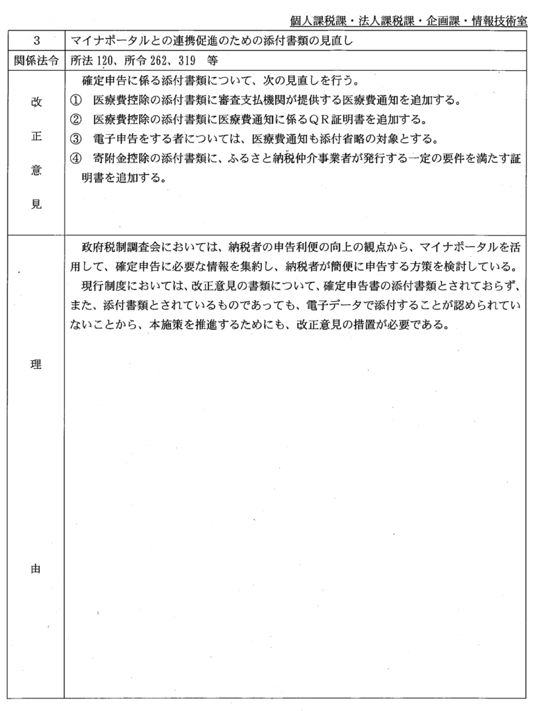| 3 | マイナポータルとの連携促進のための添付書類の見直し | 所法120、所令262 等 | 新規 | 個人課税課法人課税課企 画 課 情報技術室 | 3 |