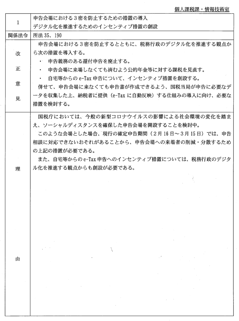 | 1 | 申告会場における3密を防止するための措置の導入 デジタル化を推進するためのインセンテイプ措置の創設 | 所法35、190 | 新規 | 個人課税課情報技術室 | 1 |