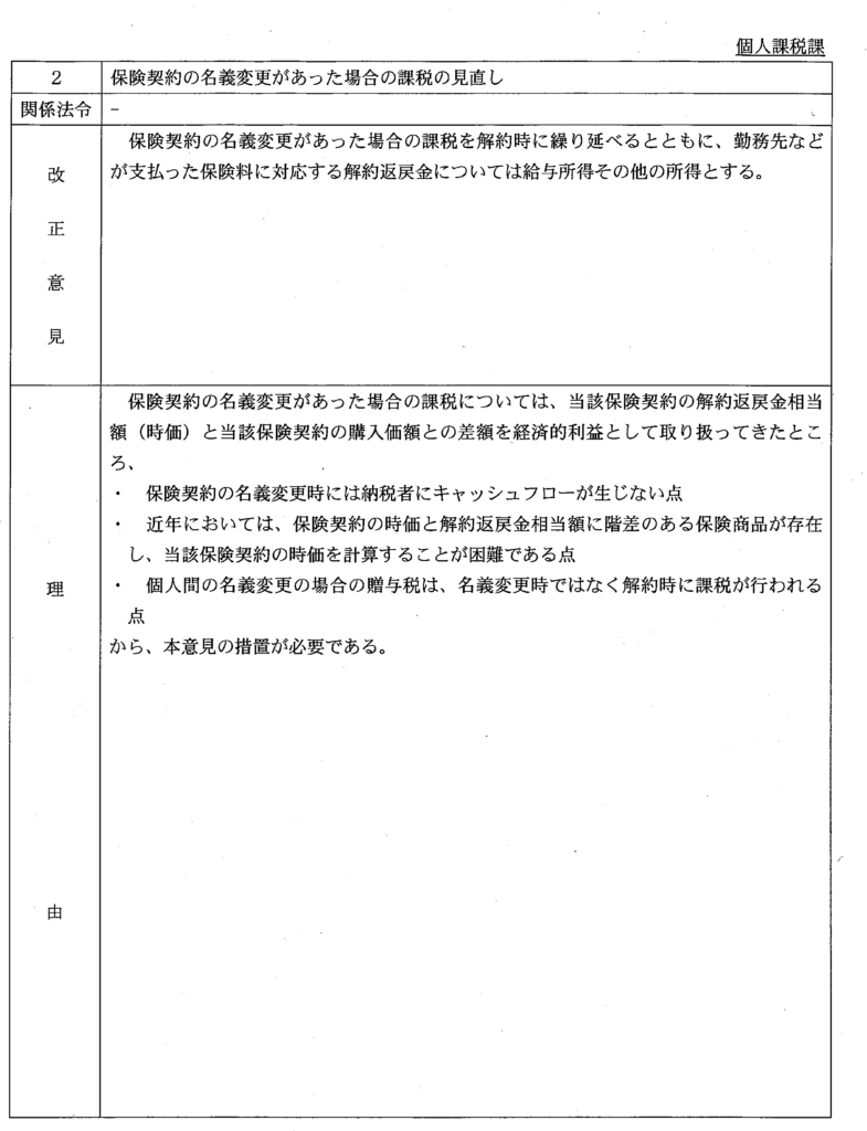 | 2 | 保険契約の名義変更があった場合の課税の見直し | 新規 | 個人課税課 | 2 | |