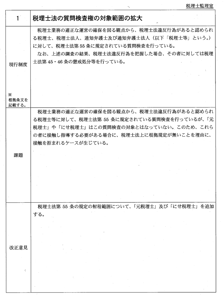 | 1 | 税理士法の質問検査権の対象範囲の拡大 | 総 務 課 (税理士監理室) | ||||||