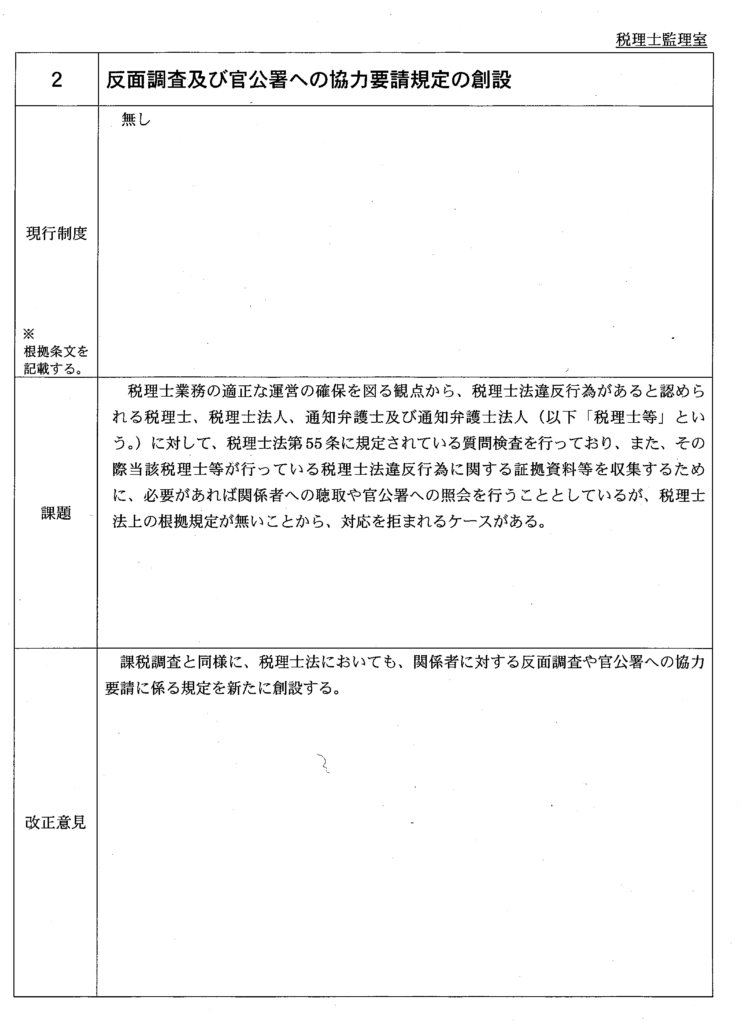 | 2 | 反面調査及び官公署への協力要請規定の創設 | 総 務 課 (税理士監理室) | ||||||