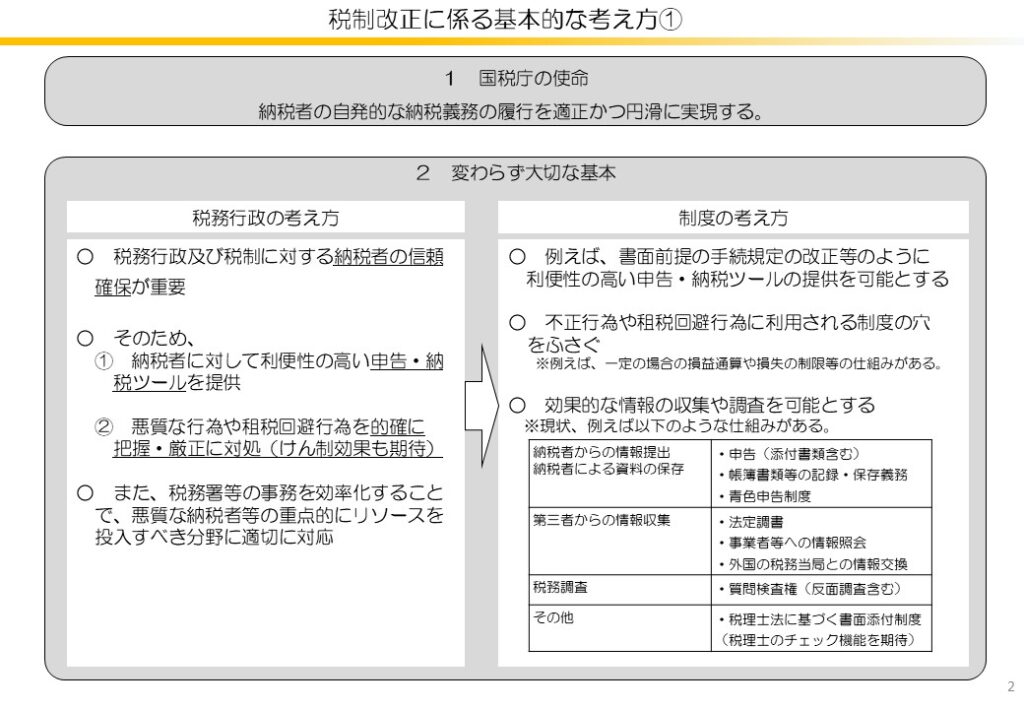 - 近年、税務行政を取り巻く環境は、経済取引の複雑 広域化、不正手口の巧妙化等により、ますます厳しくなってきている。一方、国民の税制及び税務行政に対する関心は一段と高まるとともに、租税負担の公平確保に対する要請が一層強くなっている。