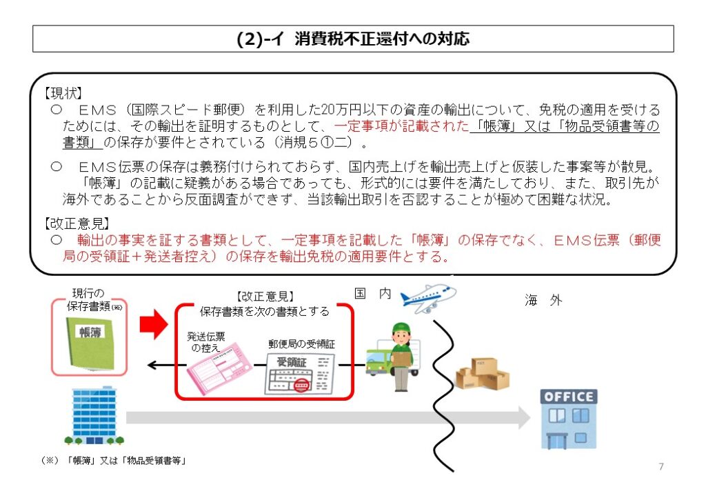 | 13 | 国際郵便による輸出免税における証明書類の保存要件の見直し | 消法7、消規5 | 新規 | 消費税室課税総括課 調 査課 | 15 | |||