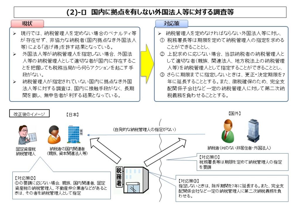 | 20 | 納税管理人制度の拡充 J | 通法117 | 新規 | 調 査 課課税総括課消費税室個人課税課資産課税課法人課税課 徴 収 課 | 22 |